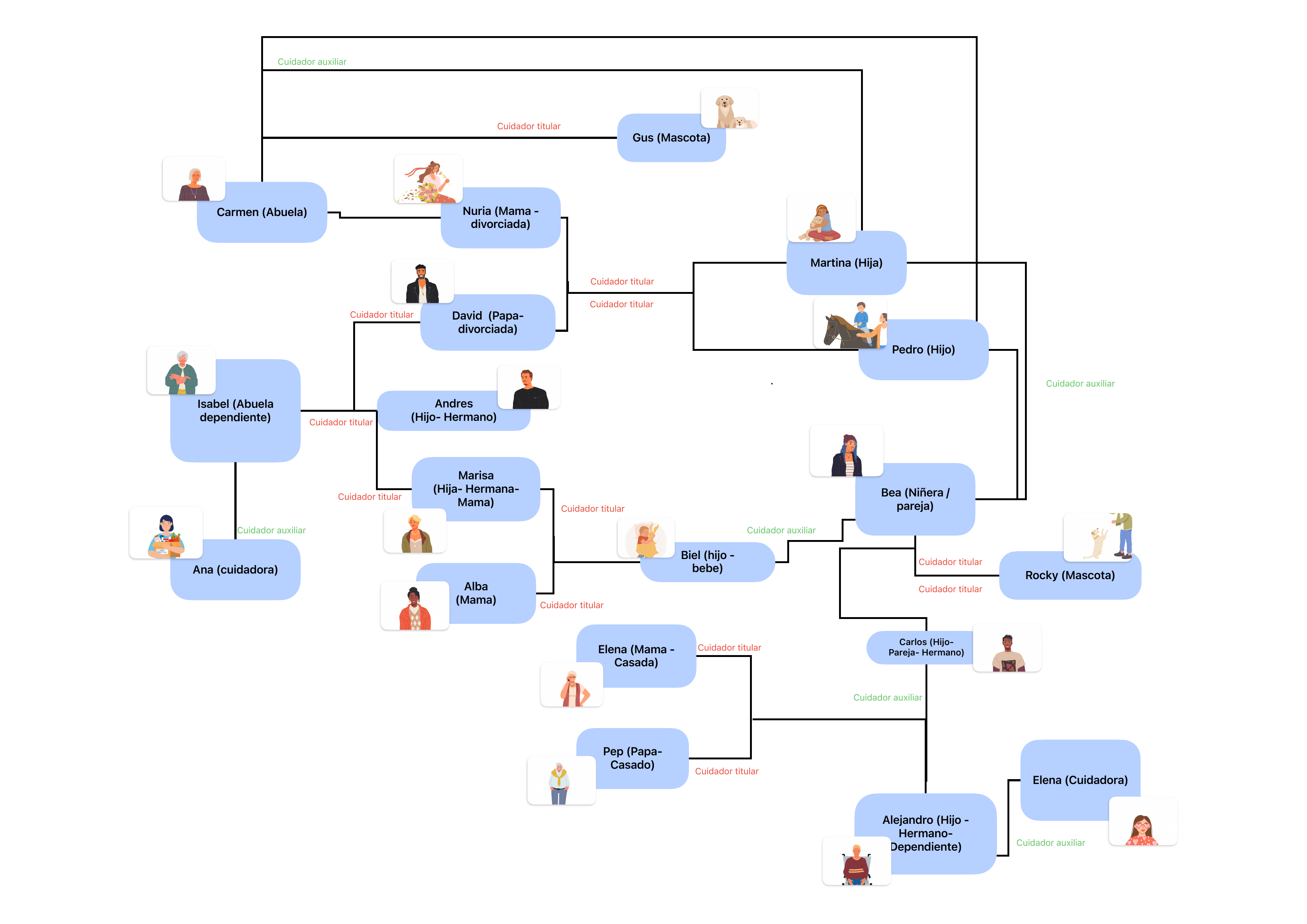 En la siguiente imagen vemos cómo Mimos App conecta a familiares, cuidadores profesionales y hasta mascotas, formando una gran red de cuidado colaborativo. Cada persona (abuela, madre, padre, hijos, tíos, mascotas, profesionales…) asume un rol (cuidador titular / auxiliar o cuidado), compartiendo responsabilidades y apoyándose mutuamente.